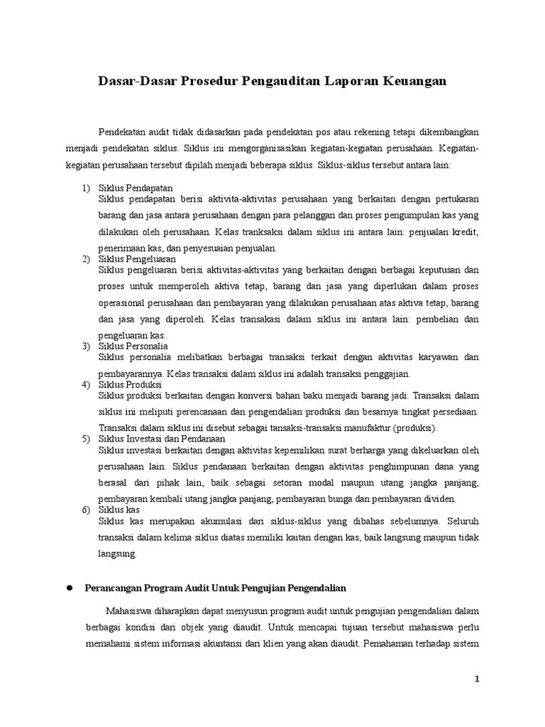Dasar Dasar Prosedur Pengauditan Laporan Keuangan / Doc Tujuan Bukti Prosedur Dan Kertas Kerja Audit Fichy Rohana Academia Edu - Contoh termasuk perbandingan laporan rinci mendukung total kontrol dalam laporan dasar, tambahan informasi yang diperlukan oleh sec, data statistik seperti rasio dan tren, dan komentar khusus tentang …. 15.05.2016 · informasi yang menyertai laporan keuangan dasar adalah setiap dan semua informasi yang disiapkan bagi pengguna manajemen atau di luar disertakan dengan laporan keuangan pokok. Bukti audit auditor akan memperoleh bukti audit yang relevan dan reliable untuk memberikan kesimpulan rasional. "prosedur kemenpora yang mestinya diaudit. 15.09.2014 · ketika prosedur substantif dilakukan pada tanggal interim, auditor seharusnya melakukan prosedur substantif atau gabungan prosedur substantif dengan uji rinci untuk menutupi sisa periode yang menyediakan dasar yang cukup terhadap perluasan kesimpulan audit dari tanggal interim ke akhir periode. Menurut (arens dan loebbecke, 2003), …